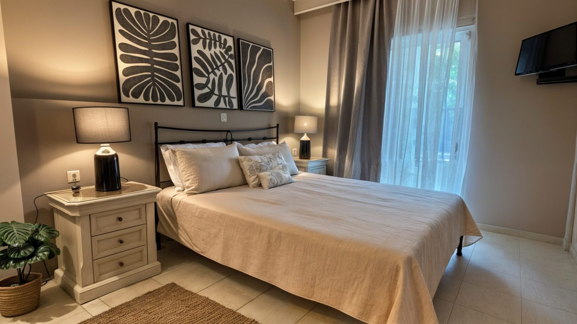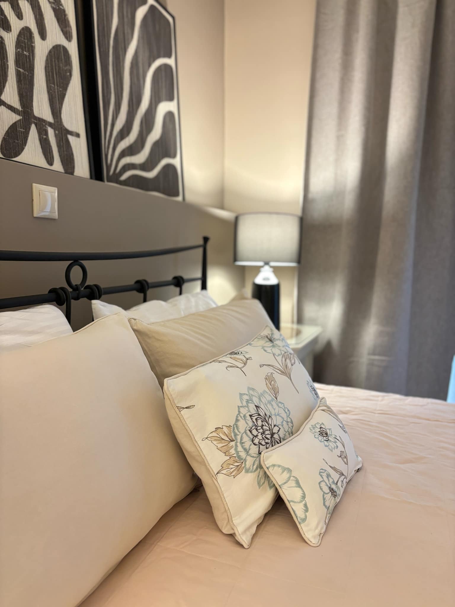 In neutral shades, with romantic details inspired by nature, Peonia ground floor apartment sleeps up to 5 people. It has two separate rooms, one with a king size custom-made iron bed, the other with two singles.